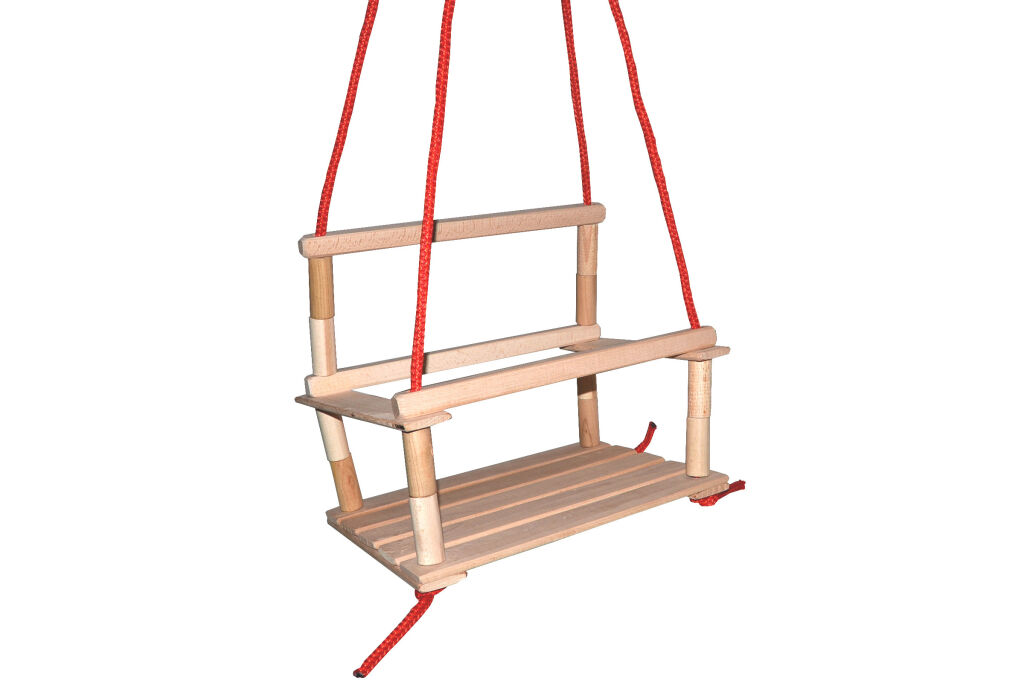 Kdo by neznal klasickou dřevěnou houpačku. Houpačka s opěradlem, bočnicemi, přední zábranou a závěsnými lany.