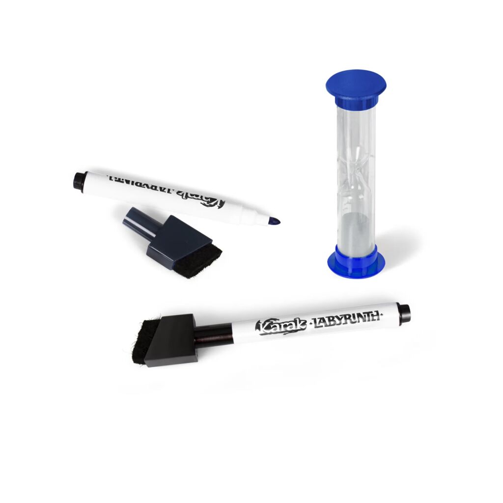 Hra Karak: Labyrinth obsahuje: 4 oboustranné popisovací archy labyrintu, 4 mazatelné fixy, 56 popisovacích dílků minihher, 49 karet úkolů, 1 přesýpací hodiny (30s), 8 žetonů rychlosti, 4 přehledové karty, pravidla v českém, slovenském a polském jazyce.