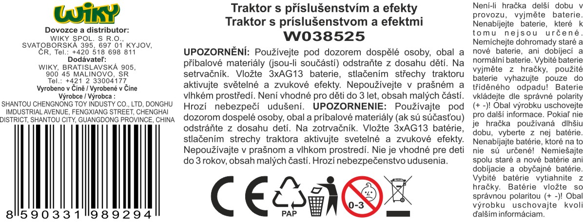 Traktor s příslušenstvím. Rozměry 37x10,5x12 cm. Dvojitá kola. Na setrvačník. Světelné a zvukové efekty. 3xAG13 baterie součástí.